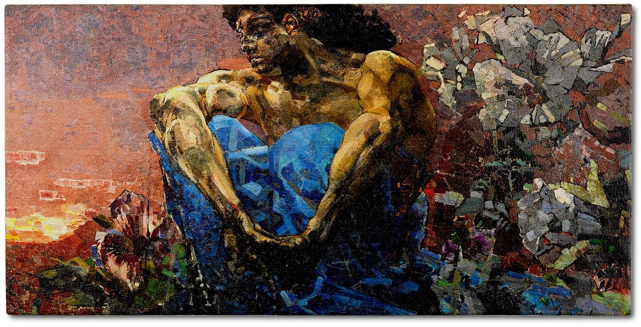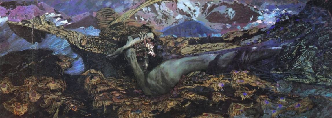 Полина: «Мцыри мог бы узнать себя в образе демона, изображенного на картине на картине Врубеля “Демон сидящий». В ней он мог увидеть себя как “изгнанника”, почувствовавшего свою непринадлежность “духовному миру”, в который он был погружен не по своей воле. Демона окружают цветы, выполненные в насыщенных сине-фиолетовых оттенках, они не кажутся живыми, они словно расколоты, так же как его мечты о свободной и вольной жизни, полной страстей и волнений».