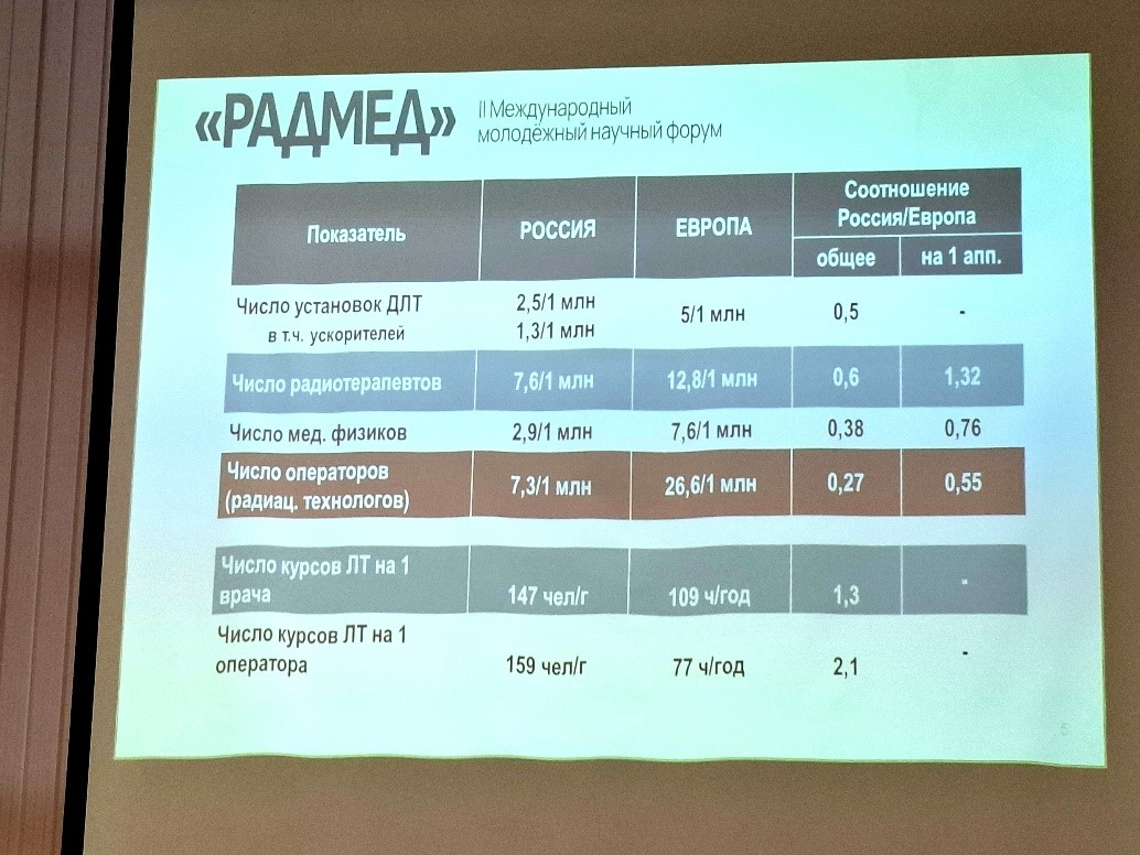 По статистике количество установок у России примерно в 2-3 раза меньше, чем в целом по Европе, количество радиотерапевтов у нас – 7,6 человек на 1 млн населения, за рубежом – 12,1, Количество медицинских физиков у нас – 2,9 на 1 млн населения, у них – 7,6, количество операторов (радиационных технологов) 7,3 и 26,6 соответственно. На одного врача в России в год приходится 147 человек, проходящих в год курсы лучевой терапии, в Европе – 109, на одного оператора – 159 и 77 человек соответственно.