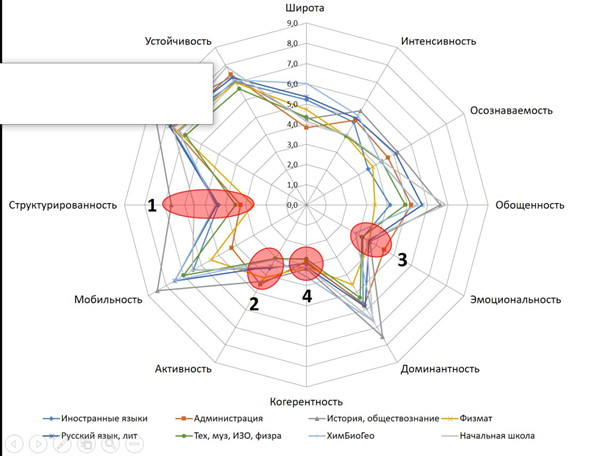 По итогам анкетирования оказалось, что нашей образовательной среде недостает структурированности, активности, когерентности (взаимосвязи между различными частями системы или процесса). Особенно меня удивили низкие оценки по показателю «эмоциональность» – соотношение в среде эмоционального и рационального компонентов, что меня как директора совершенно шокировало.