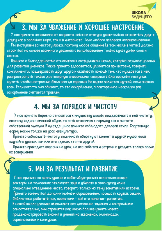 Поэтому мы провели специальные педсоветы и стратегические сессии, стали активнее поддерживать школьное самоуправление, чтобы дети не только предлагали какие-то идеи, но имели возможность их реализовать. Издали правила, разместили их прямо на входе в школу. Заметьте, в этих правилах нет запретов, в них отсутствует частичка «не».