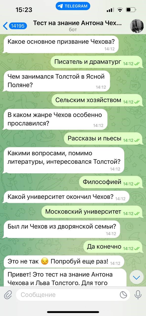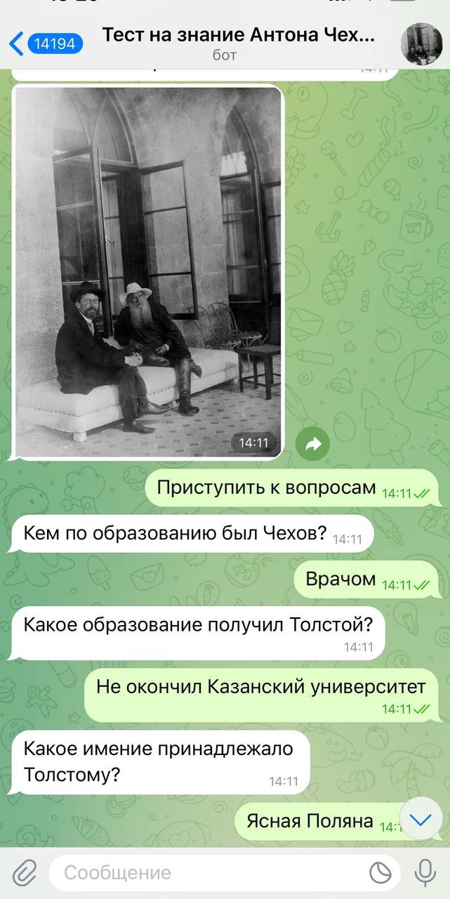 Радослав создал чат-бот с краткой информацией и вопросами по биографии А.П. Чехова и Л.Н. Толстого. Этот чат-бот мы задействовали на уроках литературы в обоих 6 классах, как проверочную работу по биографии писателей.