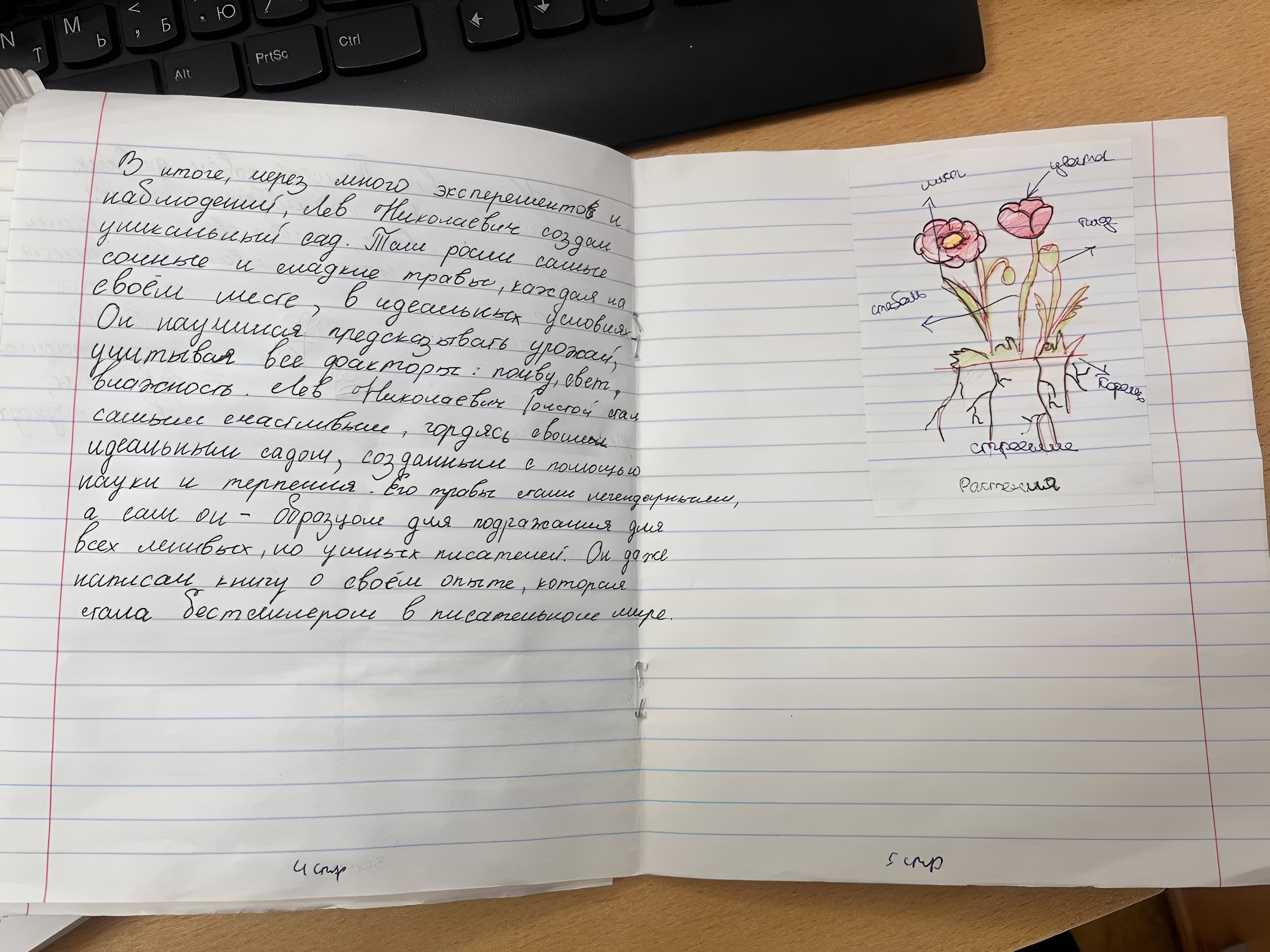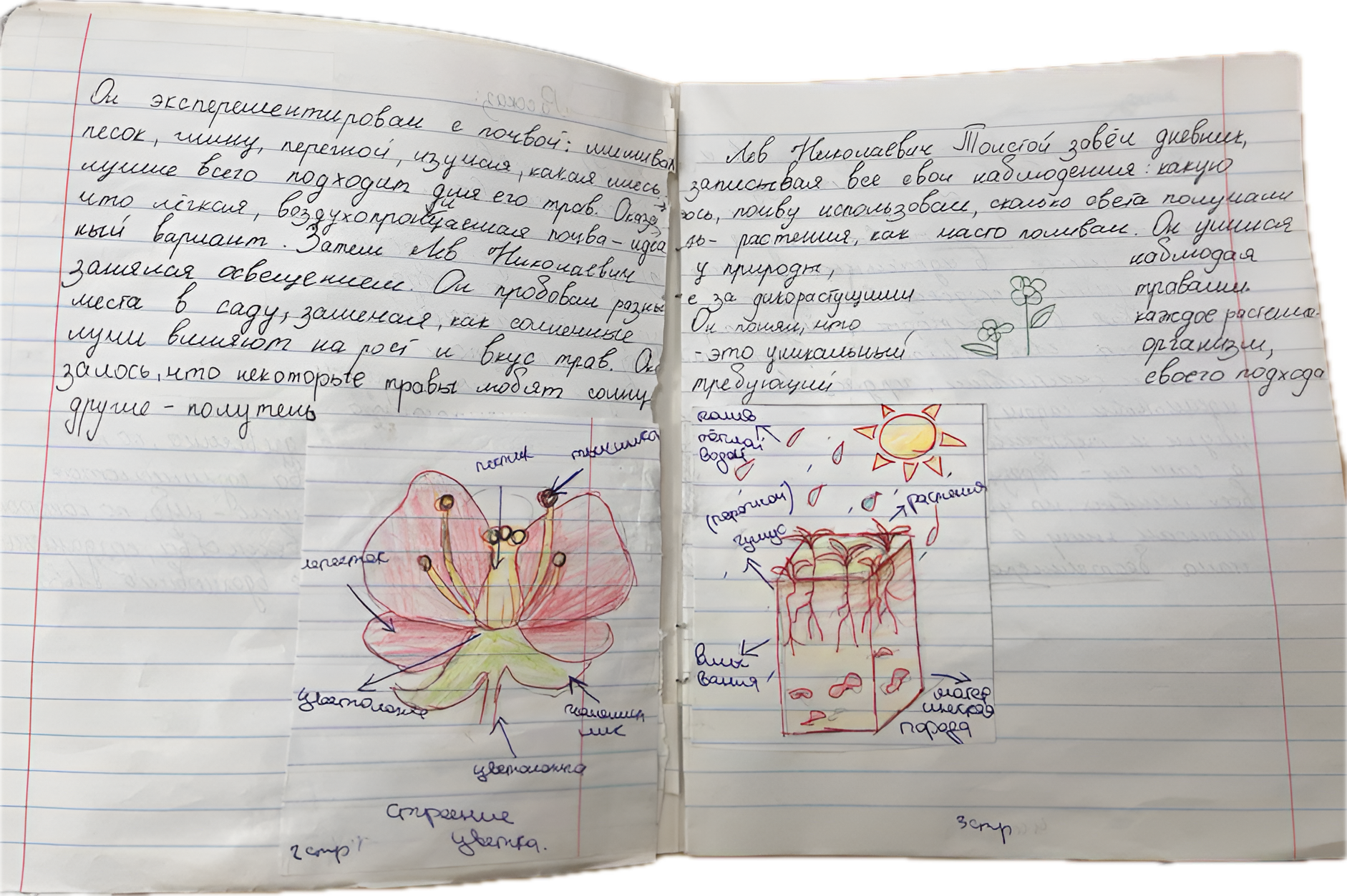 Анастасия и Арина попросились объединиться и придумали собственный рассказ про Льва Толстого, который решил вырастить свой миниатюрный сад с лекарственными растениями. Они не только описали пользу некоторых лекарственных трав и влияние окружающей среды на растение, но и сделали детальные рисунки строения цветка. За эту работу девочки получили отличные оценки по литературе, русскому языку и биологии.