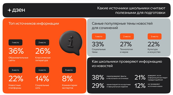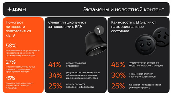 Аналитики новостной платформы Дзен изучили, какую роль контент играет в подготовке старшеклассников к экзаменам. Они провели опрос* и выяснили, что 58% школьников используют примеры из новостей при написании сочинений по русскому языку и литературе. При этом ещё 45% опрошенных регулярно следят за новостями о ЕГЭ, чтобы быть в курсе изменений.