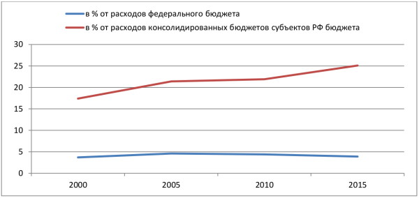 Государственные расходы на образование практически не увеличиваются, кроме того государство все активнее перекладывает заботу о финансировании этой сферы на бюджеты субъектов федерации, уровень экономического благосостояния которых, как известно, очень разный. К началу двадцать первого столетия 3,7% федерального бюджета страны доставались системе образования, спустя пятнадцать лет доля осталась прежней — 3,9%. А расходы, которые приняли на себя бюджеты субъектов РФ выросли с 17 до 25% (рис. 1).