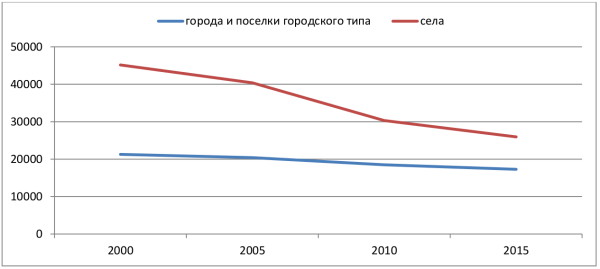 Школ в нашей стране становится меньше, особенно заметен этот процесс в сельской местности, где идет лавинообразное сокращение общеобразовательных организаций. В целом по стране за период либерального правления с 2000 по 2015 год сокращение произошло в полтора раза (с 68804 до 44848), в городах и поселках городского типа – в 1,2 раза, а на селе уже в 1,8 раз (рис. 3). А ведь практически четвертая часть жителей России относится к сельскому населению.