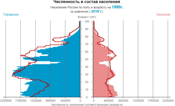 и сельского населения РФ по возрасту 1990, 2016 гг. (данные Росстата)