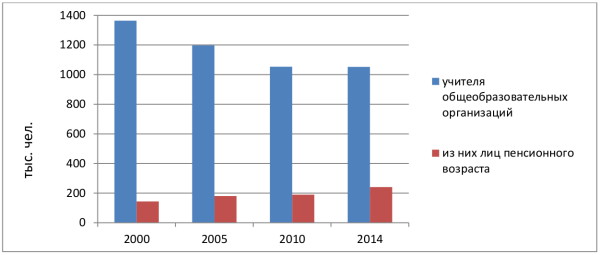 Меньше становится учеников – меньше и учителей, и все большую часть из них составляют педагоги пенсионного возраста. В 2000-м году только один из девяти сотрудников школ находился в пенсионном возрасте, в 2014-м – один из четырех (рис. 5). Не идет молодежь в педвузы, а если и идет, то по профессии работать не собирается.