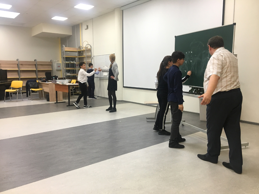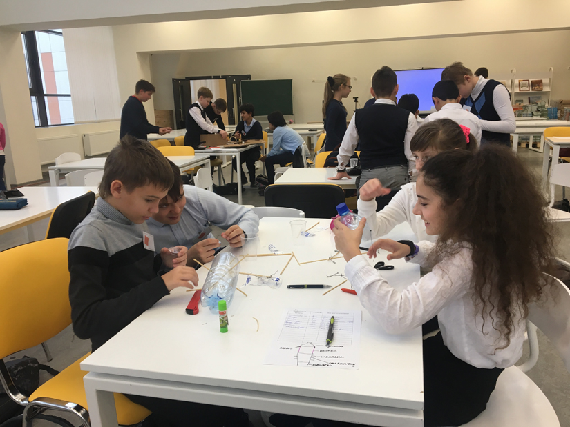 На каждой парте лежит листочек с заданием: создать тормозящее устройство для космического аппарата, позволяющее ему спускаться на Землю как можно медленнее. Через 30 минут, когда начинается апробация поделок, ученики то и дело встают на парты, чтобы спустить поделку вниз, или подкидывают изобретения в воздух, проверяя скорость спуска и торможения.