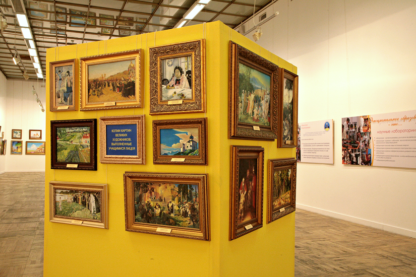 Я ожидаю увидеть картины – это ведь Центральный дом художника. В зале и правда висят картины, их много. Работы учеников органично чередуются со стендами, каждый из которых рассказывает о лабораториях лицея.