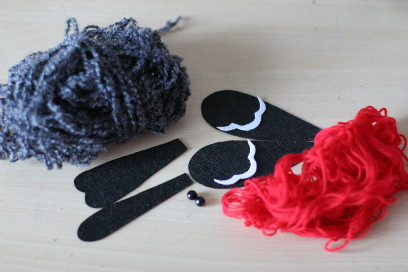 Нам понадобятся: шерстяная пряжа, картон, фетр, бусинки для глаз, палочки для суши (для клюва), акриловая краска, клей.