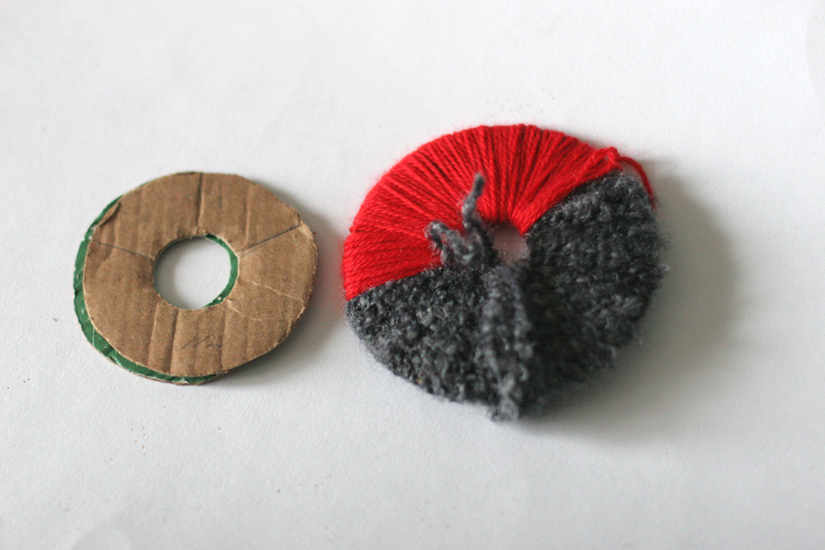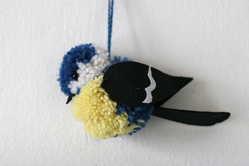 Из картона вырезаем колечки и наматываем на них пряжу, разрезаем нитки и завязываем помпон. Скрепляем вместе два помпона, приклеиваем крылья и хвост из фетра, бусинки-глазки, вклеиваем клюв.