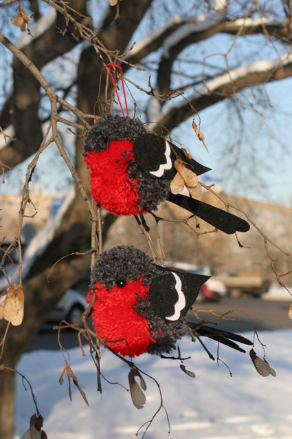 Очень простые в исполнении игрушки из шерстяных помпонов. Мы с дочкой сделали снегирей и синичку.