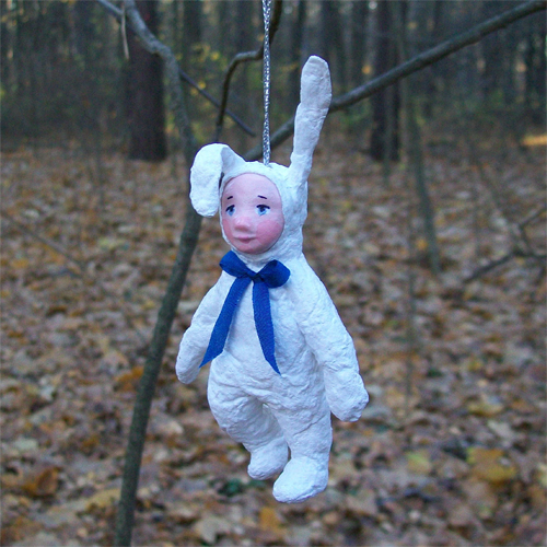 Из соленого теста лепим личико игрушки, даем ему высохнуть и красим. Ложку муки или крахмала разводим в стакане холодной воды и варим клейстер. Затем, пока клейстер остывает, делаем каркас из проволоки. Обматываем каркас ватой и смазываем клейстером. Даем игрушке высохнуть и красим готовую игрушку.