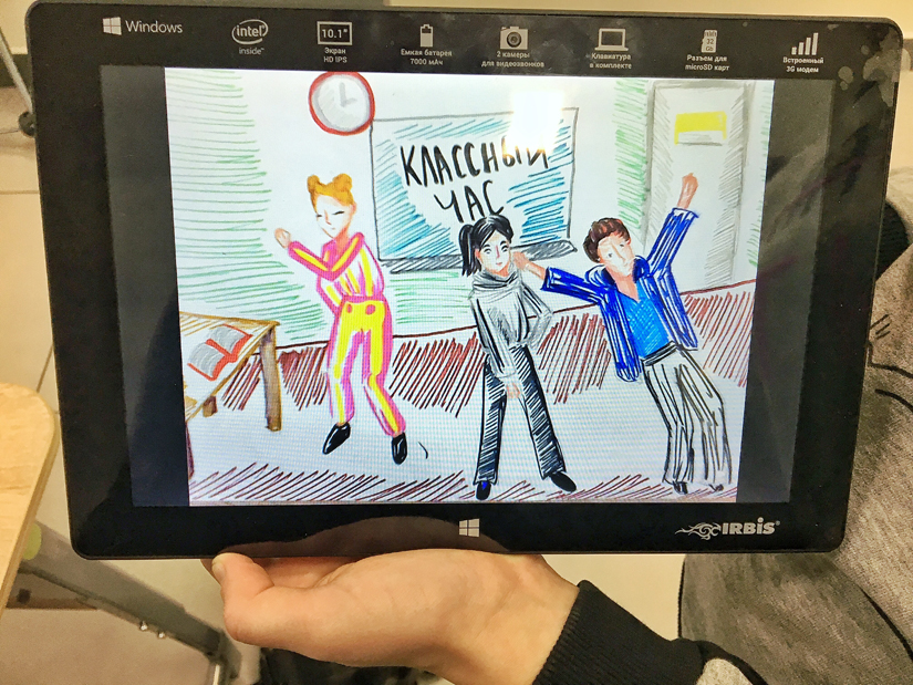 В эту сессию мастерская была занята созданием диафильма о школьной жизни, рассказывает мне Лиза, гордо демонстрируя иллюстрации.