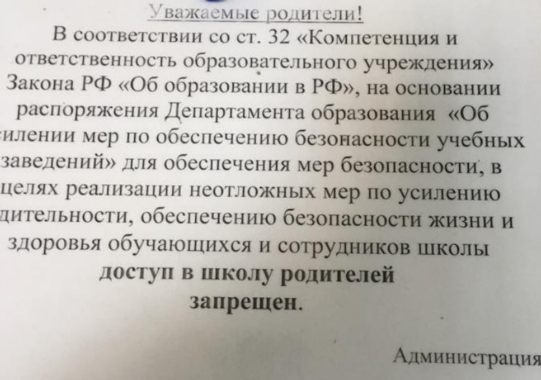 Например, в социальных сетях опубликовано одно из таких объявлений: «Уважаемые родители! В соответствии со ст. 32 «Компетенция и ответственность образовательного учреждения», Закона «Об образовании в РФ», на основании распоряжения департамента образования «Об усилении мер по обеспечению безопасности учебных заведений» для обеспечения мер безопасности, в целях реализации неотложных мер по усилению деятельности, обеспечению безопасности жизни и здоровья обучающихся и сотрудников школы доступ в школу родителей запрещен».