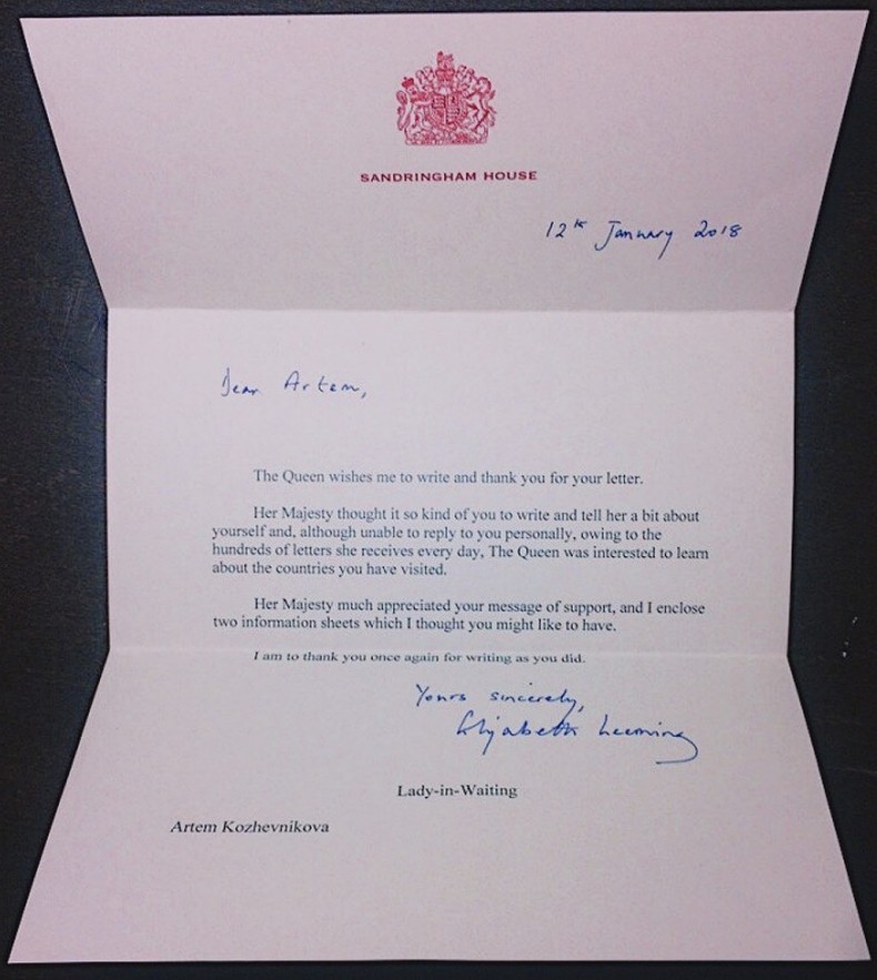 Девятиклассник Артём однажды наткнулся в сети на видео о том, как целый класс отправляет письмо королеве и заразился этой идеей. Затем он нашел адрес резиденции Елизаветы II, и прочитал все необходимые рекомендации. Признался, что писал по-английски самостоятельно, оценки по предмету – хорошие.