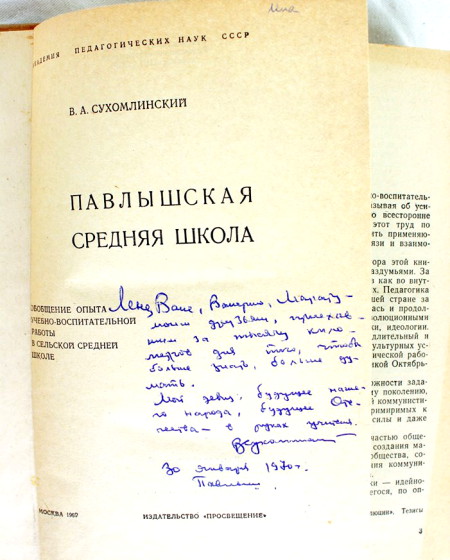 Решением ЮНЕСКО этот год назван его именем. Книгу «Павлышская средняя школа» Василий Александрович подарил мне и моим друзьям в 1970 году. Мы были тогда молоды и пытливы, учились в университете и, однажды, поехали к нему в гости в село Павлыш Кировоградской области. След от этой встречи остался в нас на всю жизнь».