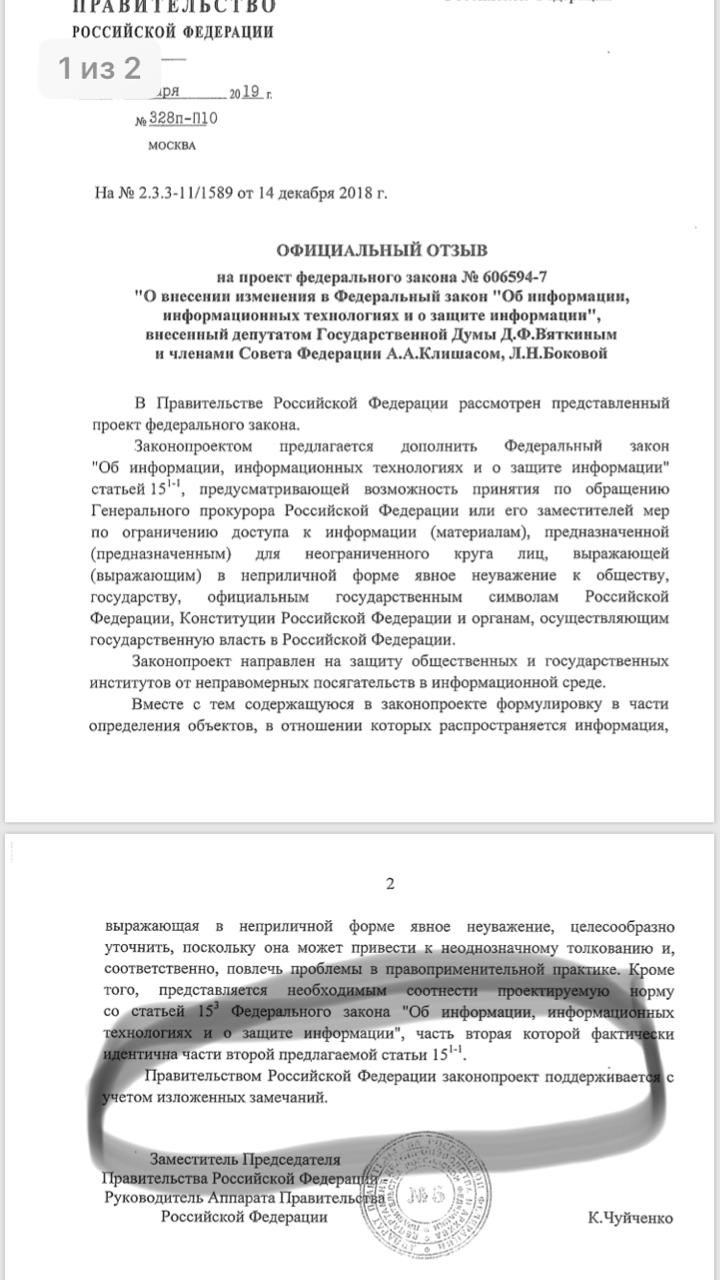 Благодарим сенатора Людмилу Бокову за предоставленный текст отзыва Правительства РФ, подписанный заместителем Председателя Правительства РФ, руководителем Аппарата Правительства Константином Чуйченко.