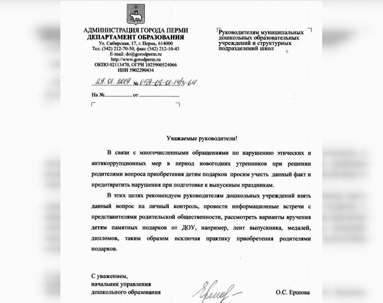 «В связи с многочисленными обращениями по нарушению этических и антикоррупционных мер в период новогодних утренников при решении родителями вопроса приобретения детям подарков просим учесть данный факт», — говорится в тексте документа. Обращение подписано начальником Управления дошкольного образования Перми Ольгой Ершовой.