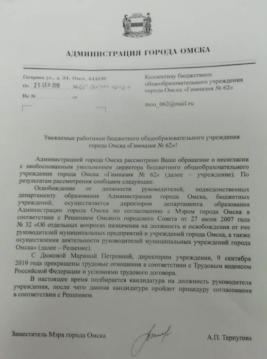 Так, уже несколько учителей опубликовали на своих страницах «ВКонтакте» письмо от мэрии Омска педагогам гимназии, где учителям отвечают на обращение о несогласии с увольнением директора. В письме, в частности, говорится, что решение об увольнении бывшего руководителя гимназии № 62 Марины Дюковой было принято в соответствии с законом.