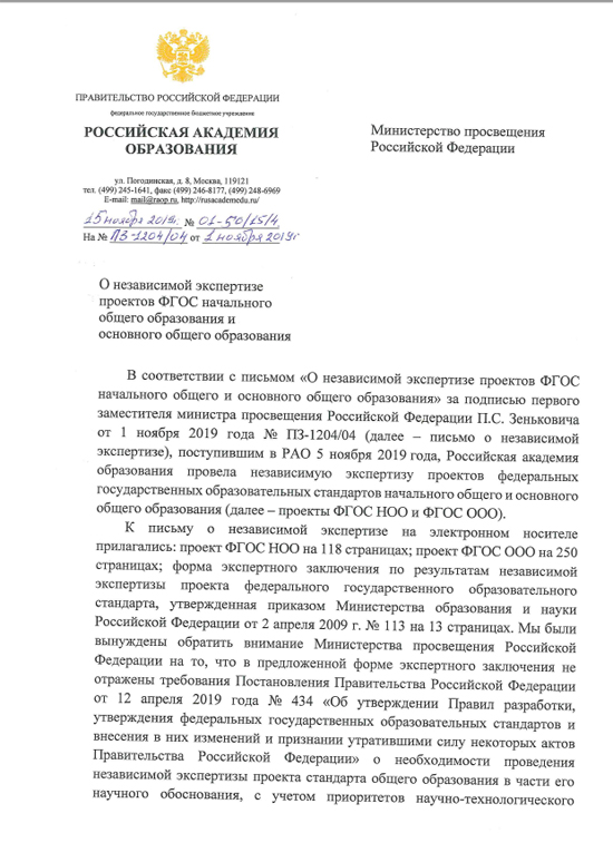 К письму о независимой экспертизе на электронном носителе прилагались: проект ФГОС НОО на 118 страницах; проект ФГОС ООО на 250 страницах; форма экспертного заключения по результатам независимой экспертизы проекта Федерального государственного образовательного стандарта, утвержденная приказом Министерства образования и науки Российской Федерации от 2 апреля 2009 г. № 113 на 13 страницах. Мы были вынуждены обратить внимание Министерства просвещения Российской Федерации на то, что в предложенной форме экспертного заключения не отражены требования постановления правительства Российской Федерации от 12 апреля 2019 года № 434 «Об утверждении Правил разработки, утверждения Федеральных государственных образовательных стандартов и внесения в них изменений и признании утратившими силу некоторых актов правительства Российской Федерации» о необходимости проведения независимой экспертизы проекта стандарта общего образования в части его научного обоснования, с учетом приоритетов научно-технологического развития Российской Федерации и плана мероприятий по реализации Стратегии научно-технологического развития Российской Федерации.