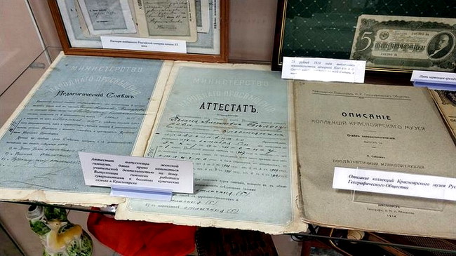 В экспозиции представлен паспорт подданного Российской империи, от которого, к сожалению, сохранилась только обложка, а также аттестат выпускницы женской гимназии Пелагеи Алексеевны Белогуровой. Документ давал девушке право заниматься учительской деятельностью на дому. Выпускницы гимназии работали гувернантками в купеческих семьях.