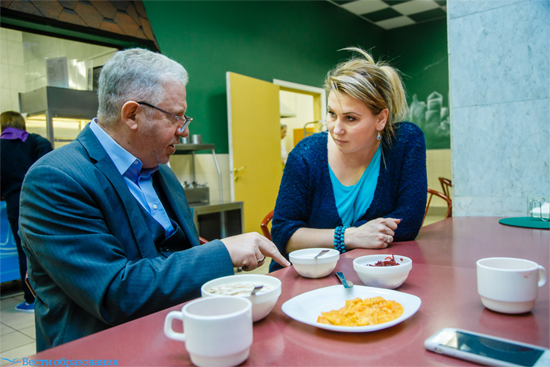 Эта – Наталья Вячеславовна Пчелкина, ответственная за питание в школе, с ней подробно выясняем маршрут школьной еды. Кто привозит, кто принимает, как оценивает пригодность, качество. Такая строгая! Добилась от меня полного понимания всего процесса, с повторением и закреплением пройденного материала. Вот как раз идет проверка знаний.