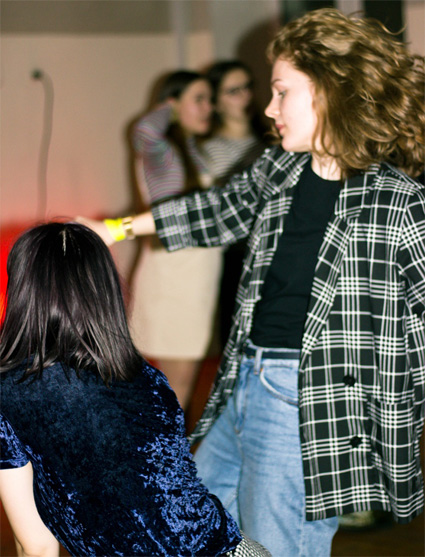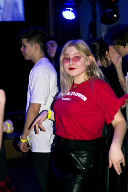 Поднимаясь в актовый зал на пятый этаж, в эпицентр событий, можно увидеть сидящих на лестницах краснощеких лицеистов со стаканами воды – выдохлись. У входа на пятый этаж на полу разбросаны желтые браслеты на вход. Видимо, организаторы не выдержали и сами побежали танцевать, оставив свои посты у входа. В актовом зале атмосфера как в молодежном клубе, только у стены притаился бдительный наблюдатель с книжкой – учитель обществознания, курирующий процесс. Кто танцует, ловя многочисленные звуки бьющей в голову электроники, кто стоит, чувствуя себя некомфортно за неимением компании. Как на любой дискотеке, кто-то отрывается, а кто-то не может найти себе места.