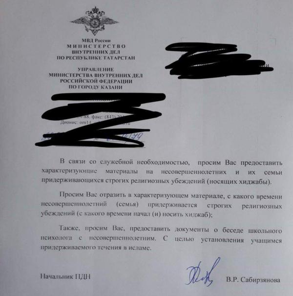 В письме, адресованном директорам школ, начальник ПДН «в связи со служебной необходимостью» просит предоставить «характеризующие материалы на несовершеннолетних, придерживающихся строгих религиозных убеждений (носящих хиджабы)», а также указать, с какого времени они носят хиджабы.