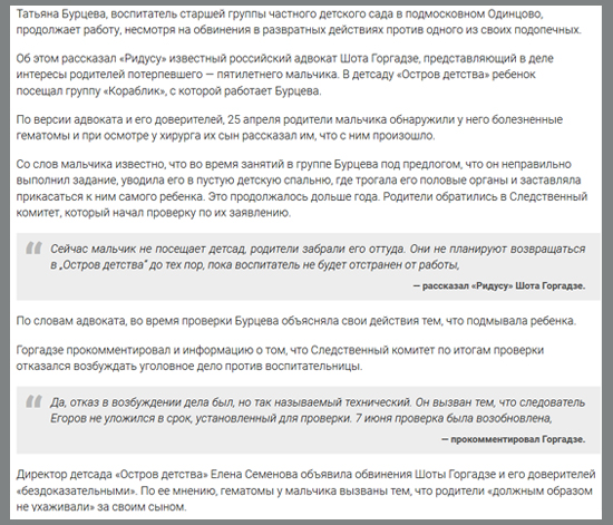 25 апреля 2019 года мать пятилетнего мальчика обвинила одну из воспитательниц частного детского сада «Остров детства» (Одинцовский район, Московская обл. – Прим. ред.) Татьяну Бурцеву в насильственных действиях сексуального характера в отношении сына. По её словам, Татьяна Бурцева под тем или иным предлогом уединялась с ребёнком (в спальне или туалетной комнате) и принуждала мальчика трогать свой половой орган, вследствие чего у мальчика появились болезненные гематомы.