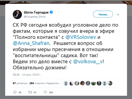 Не трудно догадаться, что хочет сказать своим постом Шота Горгадзе. Только один вопрос: разве это его прерогатива – выносить и озвучивать на всю страну обвинения до каких-либо комментариев и заключений Следственного комитета? Бездоказательно сравнивать уход за ребёнком с преступлениями Чикатило - это и есть убийство репутации, а может и подталкивание человека к самоубийству. Вина может быть не доказана, скорее всего, а невинный человек может пойти на самые крайние меры - кто за это будет отвечать?