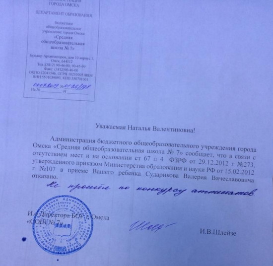 Как видно из официального ответа, предоставленного читательницей Города55, основанием отказа послужило отсутствие мест в школе. Однако ниже уточняется, что ученик не прошел по конкурсу аттестатов.
