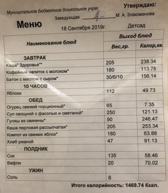 На снимке видно, что целый день воспитанников кормили традиционной для детского сада едой: каша на завтрак, суп и гуляш на обед, на полдник – сок и вафли. Однако в графе «Ужин» значится только одна строчка – «Соль, 6 граммов». Позднее еще один пользователь в комментариях выложил новое фото меню. На нем надпись «Соль» перечеркнута, а вместо нее ручкой указано: «Не будет».