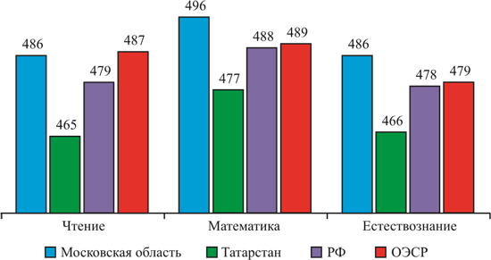 Имеющиеся данные для Подмосковья и Республики Татарстан свидетельствуют о серьезных значимых различиях в результатах учащихся по всем трем предметам. Более того, они отличаются от средних баллов по стране больше, чем результаты России отличаются от среднего по странам ОЭСР.