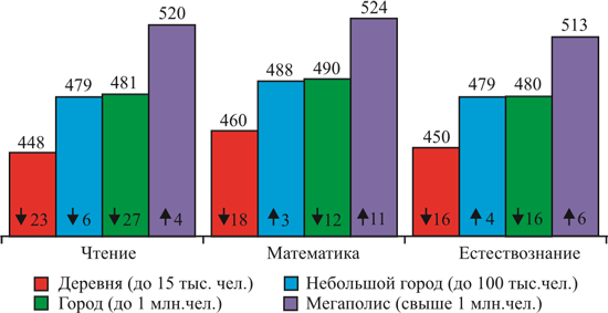 Большие различия наблюдаются в результатах учащихся из городов и сел. По чтению учащиеся из сельской местности отстают от жителей городов-миллионников в среднем на 72 балла, по математике – на 64, по естествознанию – на 63. По сравнению с 2015 годом больше всего снизились баллы в селах и городах с населением от 100 тысяч до 1 млн человек. Наибольшее снижение результатов наблюдается по чтению: в сельской местности – на 23 балла, в крупных городах – на 27. Учащиеся в городах-миллионниках по всем трем предметам показали прирост баллов, но незначительный: 4 балла по чтению, 11 по математике и 6 по естествознанию.