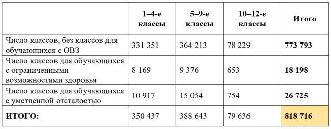 Согласно даннымотчета ОО № 1 «Сведения об организациях, осуществляющих образовательную деятельность по образовательным программам начального общего, основного общего, среднего общего образования», общее число очных школьных классов в России насчитывает почти 819 тысяч.