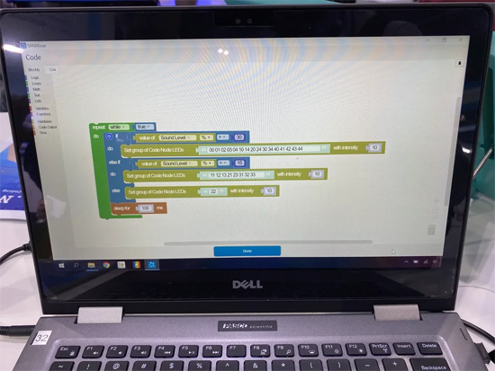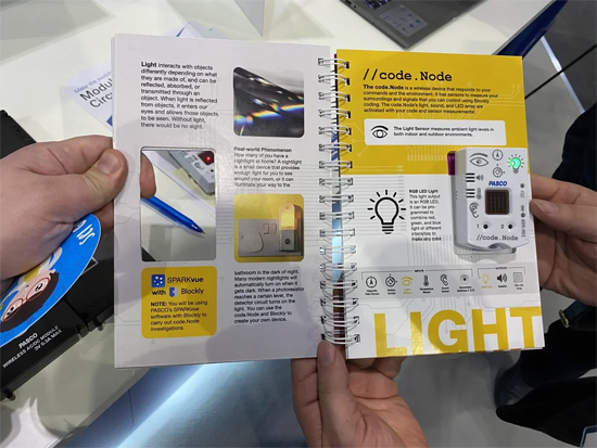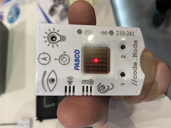Компания PASCO очень давно работает на рынке оборудования для преподавания STEM. Главной новинкой, представленной на BETT, стал набор //code.Node. Это небольшой программируемый блок с сенсорами температуры, звука, света, датчиком движения и магнитного поля, а также динамиком и небольшим LED-экраном 5x5 точек. Устройство подключается к компьютеру, планшету или мобильному телефону по Bluetooth. Набор предназначен для интегрированного изучения программирования и естественно-научных дисциплин, нацелен на младшую и начало средней школы. Программируется блочной Scratch-подобной средой. В комплекте с блоком поставляется книжка с заданиями, к которой Node крепится на «липучке». В продаже появится в апреле, цену в США обещали в районе 110 долларов. К сожалению, устройство не сможет автономно собирать показания, как это умеют делать другие сенсоры PASCO.