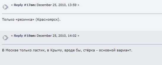 Стёрка или ластик? Или, может быть, стиралка, стирашка, резинка? А как насчёт клячки? Одну и ту же школьную принадлежность люди в разных городах называют десятком разных слов. В Москве большинство использует слово «ластик», а в Петербурге и других провинциальных городах чаще встречаются варианты «стёрка» и «стиралка». Носители разных культур отказываются считать друг друга грамотными.