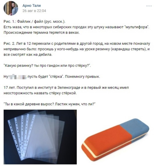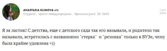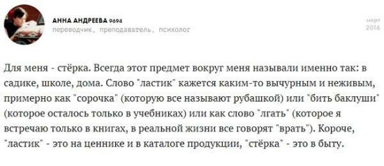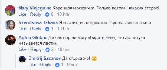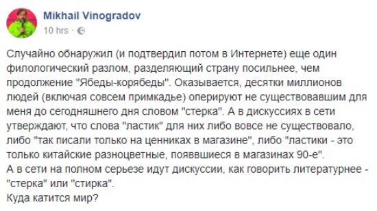 Виноградов опубликовал результат поиска по ключевым словам и прокомментировал его: он всю жизнь считал, что стиральная резина для карандаша называется «ластик», а недавно впервые узнал слово «стёрка» и пребывает в полном недоумении от того, что им пользуются «десятки миллионов людей».