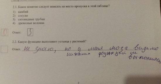 Много споров вызвали явно издевательские ответы. По всей видимости, дети не знали, что ответить, и просто шутили. Один из школьников написал, что его мозг никаких функций не выполняет, и предпочел не отвечать на поставленный вопрос по биологии.