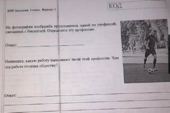 Шестиклассникам предложили определить профессию изображенного на фотографии человека, которая якобы связана с биологией. Вопрос вроде бы и простой, но на картинке изображен футболист. Мнения учителей разделились. Одни посчитали это задание нелогичным, а другие, напротив, отметили, что связь спортсмена с предметом очевидна: футболист ведет здоровый образ жизни, мотивируют людей заниматься спортом, отлично знает анатомию и физиологию.