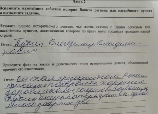 В одном из заданий школьникам предложили назвать исторического деятеля, жизнь которого связана с малой Родиной ребят. В ответе нужно было указать достижения этого человека и привести факты из жизни, которые объясняли бы его известность. Автор одной из работ написал про президента России и отметил, что Владимир Путин сделал много добрых дел. Приказал, например, построить хорошие дороги, школы и детские сады.