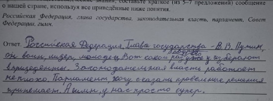 В одной из заданий по обществознанию ребятам предложили подготовить небольшое сообщение о России, используя определенные слова, в частности «законодательная власть», «парламент», «глава государства», «гимн». Один из ответов трудно читать без улыбки, но в целом школьник с заданием справился. Ребенок отметил, что Владимир Путин – воин, лидер и в целом молодец. Законодательная власть работает неплохо, да и парламент правильные решения принимает. Но особый восторг школьника вызывает гимн России.