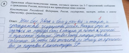 Аналогичное задание с написанием мини-сообщения с использованием слов и словосочетаний «Конституция», «государство», «паспорт», «любовь к своему отечеству» неожиданно приобрело фольклорный оттенок под пером восьмиклассника-шутника. Школьник написал про среднестатистического русского Ивана, у которого есть паспорт и гражданство. Каждое утро Иван садится на своего медведя и едет за туалетной бумагой и гречкой.