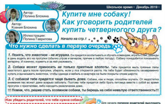 В ноябре 2019 года ученица 4-го класса Ксения Блохина написала статью в школьную газету «Как уговорить родителей купить собаку». В статье она дала много рекомендаций, одна из которых звучала так: