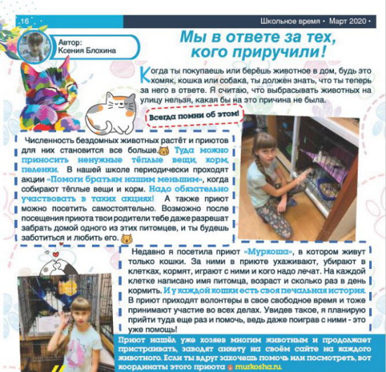 Уже в марте она написала очередной текст – репортаж о поездке в «Муркошу», где живет более 500 кошек, котов и котят. Ксюша привезла им игрушки, корм, несколько часов играла с ними, убирала в клетках. По просьбе девочки родители возили ее в приют несколько раз. Они видели, с какой любовью и заботой относится их дочь к животным.
