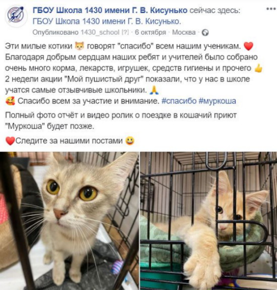 Но даже после этого Ксюша не перестала помогать бездомных животными и рассказала об очередной поездке в приют в школе. Одноклассники поддержали идею помогать животным и предложили организовать сбор кормов для «Муркоши» в школе.