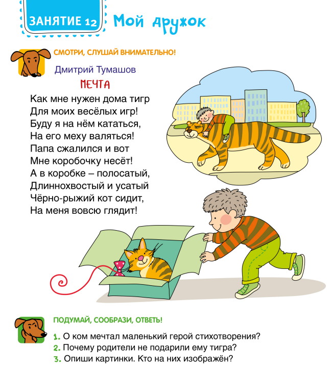 Рассмотрим первый пример из развивающего пособия для дошкольников «Хвостатые мечты». В забавном стихотворении говорится о мечте. Эта тема всегда волнует дошколят и, конечно, вызывает у них разные эмоции. Желание маленького героя – иметь дома тигра – легко мотивирует слушателя к восприятию шуточного стихотворения. Радость ожидания подарка, описание тех дел, которые может совершать с тигром герой – в центре внимания. Как хочется поддержать мальчишку! Выражение «для моих весёлых игр» находит искренний отклик в сердце ребёнка. Главное для взрослого читателя – интонировать текст выразительно, произносить его с особой интонацией, менять интонацию в процессе чтения. И в этот момент наблюдать за ребёнком, его движениями, мимикой, выражением глаз…