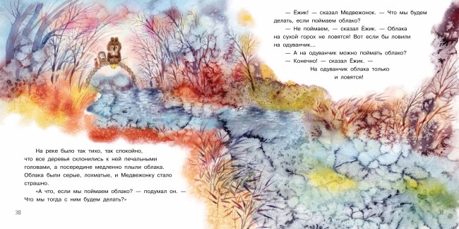 Посмотрите на чудесный разворот книги! Как притягательна иллюстрация Натальи Макаренко! Как она эмоциональна! Замысел автора и художника оказываются как бы на одной волне переживаний. Читая о страхах Медвежонка, ребёнок узнаёт, что рядом всегда может оказаться верный, понимающий Ёжик. И он обязательно объяснит: