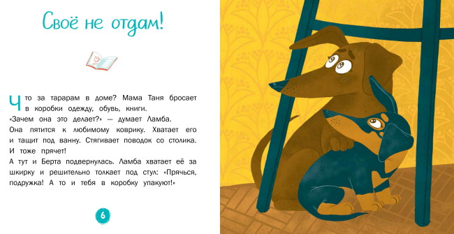 Ламба со страхом «пятится к любимому коврику», и читатель, сопереживая ей, понимает её мотив убрать с глаз долой любимые предметы. А вдруг мама и их покидает в коробки?